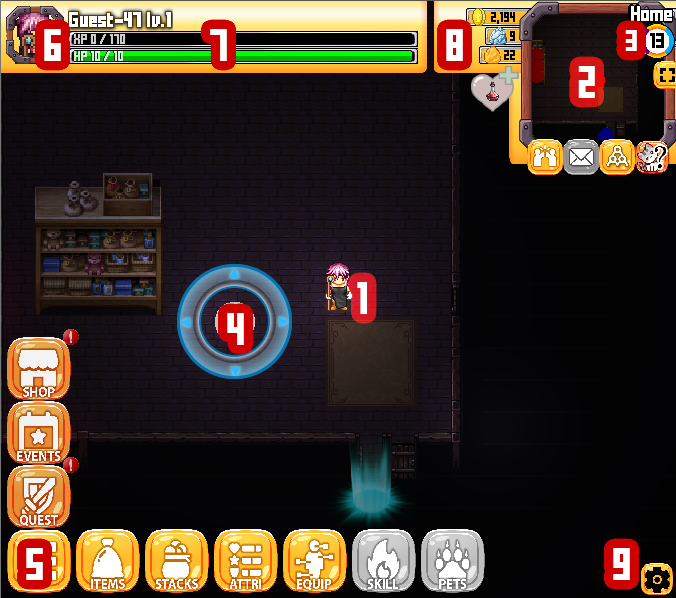 4. Joystick: Will appear when you hold a pointer, finger down. A control mechanism that allows players to move your character